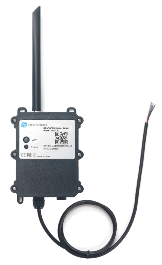 The Dragino CPL03 is an NB-IoT and LTE CAT-M Contact Sensor for the Internet of Things solution. It detects dry contact status, open time, open counts, and then upload to IoT server via NB-IoT and CAT-M network.