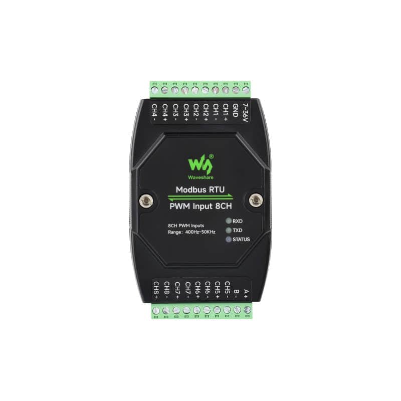 The Modbus RTU PWM Input 8CH is an isolated RS485 to 8-Ch PWM input module, supporting PWM pulse frequency and duty cycle detection. Adopts Modbus RTU protocol with built-in protection circuits such as power isolation, magnetical isolation, resettable fuse, and TVS.