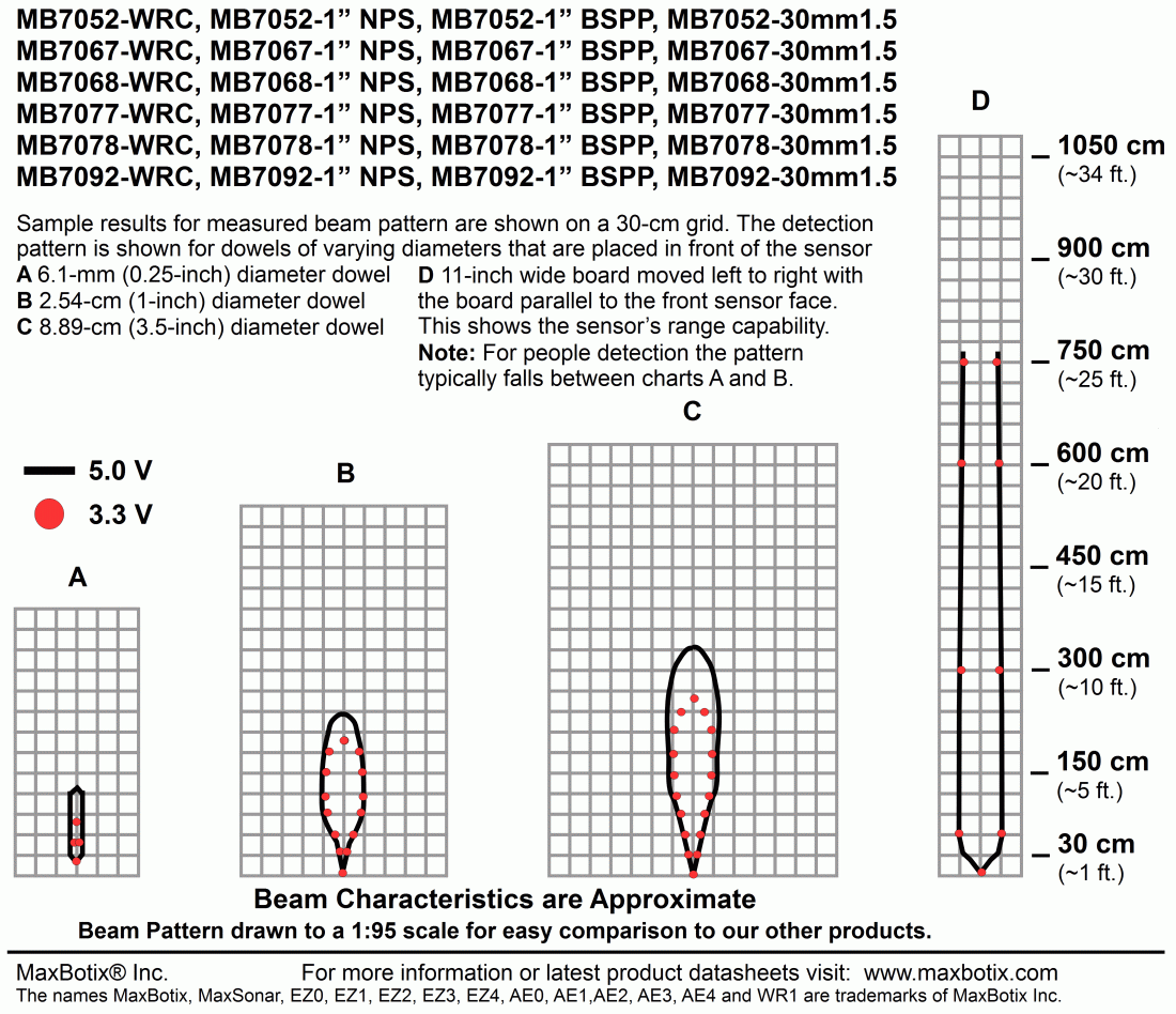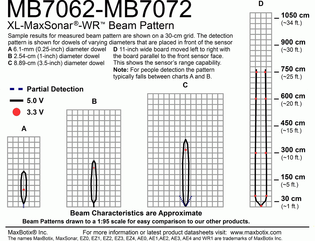 High output acoustic power combined with continuously variable gain, real‑time background automatic calibration, real‑time waveform signature analysis, and noise rejection algorithms results in virtually noise free distance readings. This holds true even in the presence of many of the various acoustic or electrical noise sources. The XL‑MaxSonar-WR sensors are factory calibrated to match narrow sensor beam patterns and provide reliable long range detection zones.