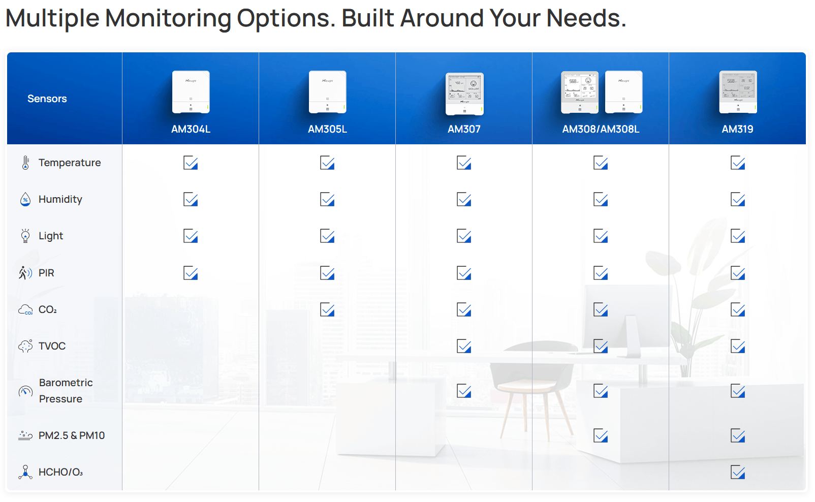 AM307/AM308/AM319 9-in-1 IAQ measures Temperature, Humidity, PIR, Light, TVOC, Barometric Pressure and CO2, Formaldehyde (HCHO) or Ozone (O3).