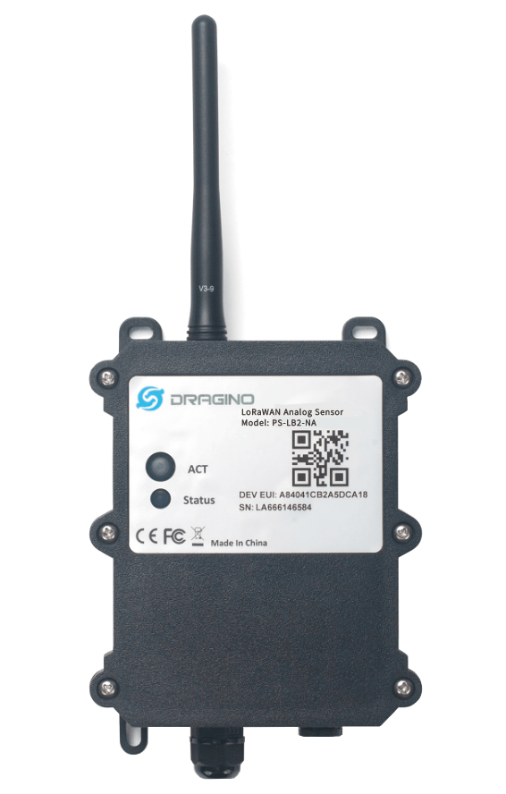 The Dragino PS-LB-NA is a LoRaWAN Analog Sensor for the Internet of Things solution. PS-LB-NA has 5v and 12v output, 4~20mA, 0~30v input interface to power and get value from Analog Sensor. PS-LB-NA will convert the Analog Value to LoRaWAN wireless data and send it to the IoT platform via the LoRaWAN gateway.
