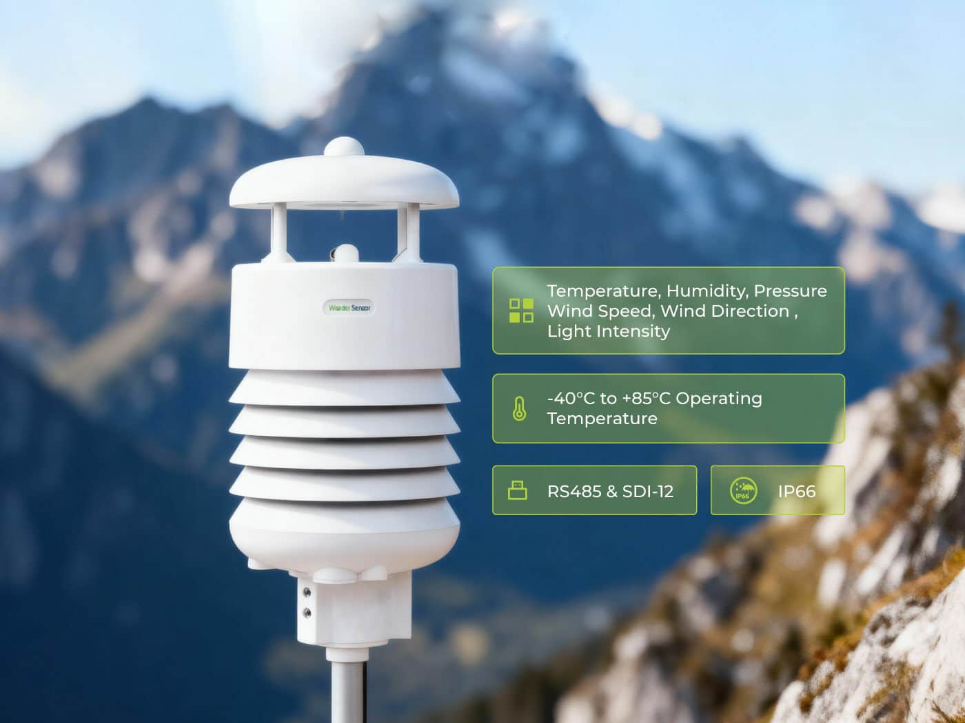 The S600-A is equipped with multiple sensors measuring crucial parameters for gathering a wealth of environmental data, including air temperature, relative humidity, barometric pressure, wind speed, wind direction and light intensity.