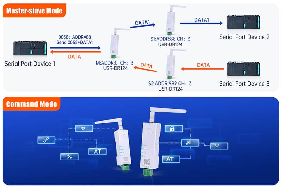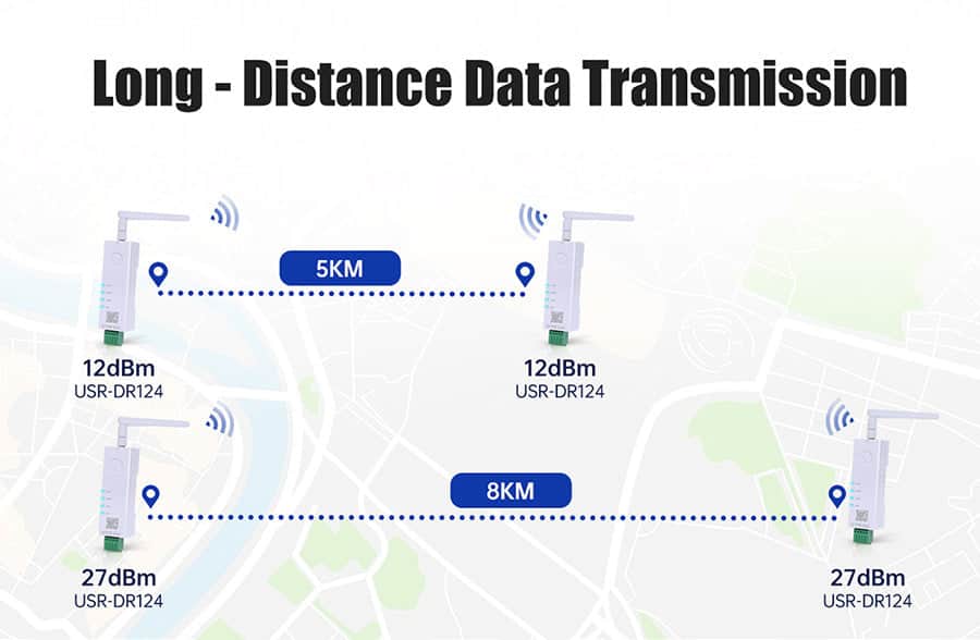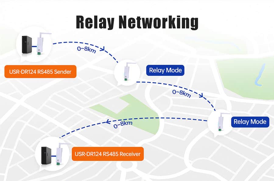 The USR-DR124 can realise multi-level relay networking, suitable for ultra-long-range or complex environment networking communication, and allows multiple networks in the same region.