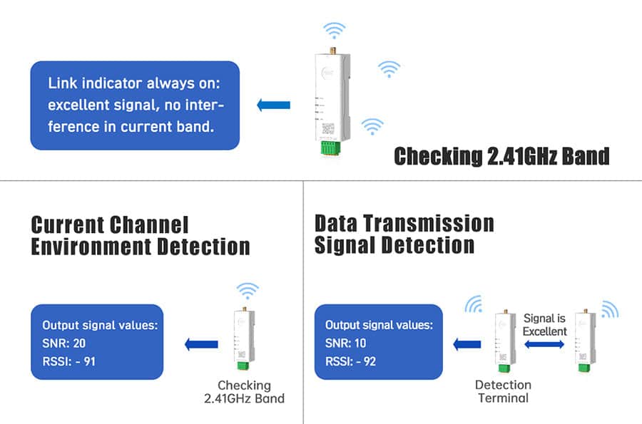 Current Channel Environment Detection: A single device detects interference in the current working band, outputs SNR and signal values to determine the signal quality of the working band.