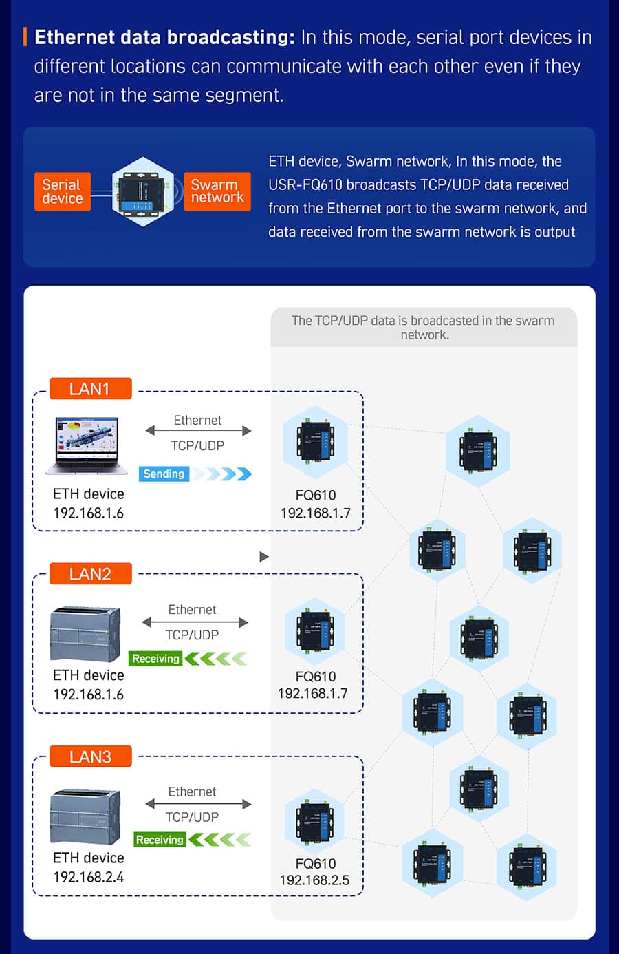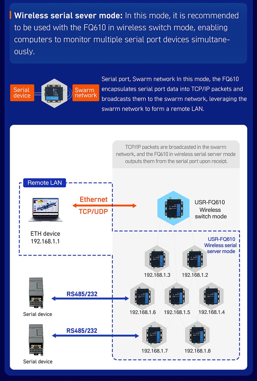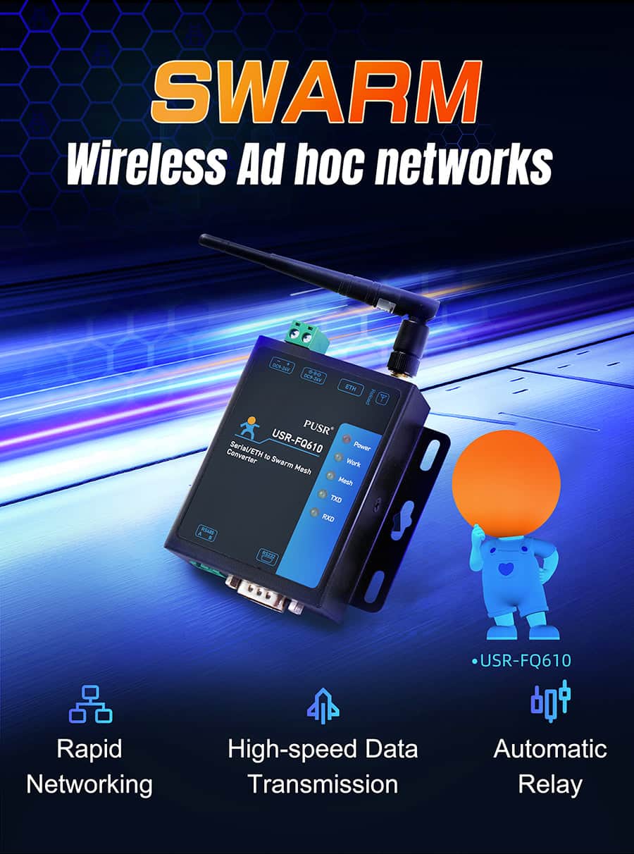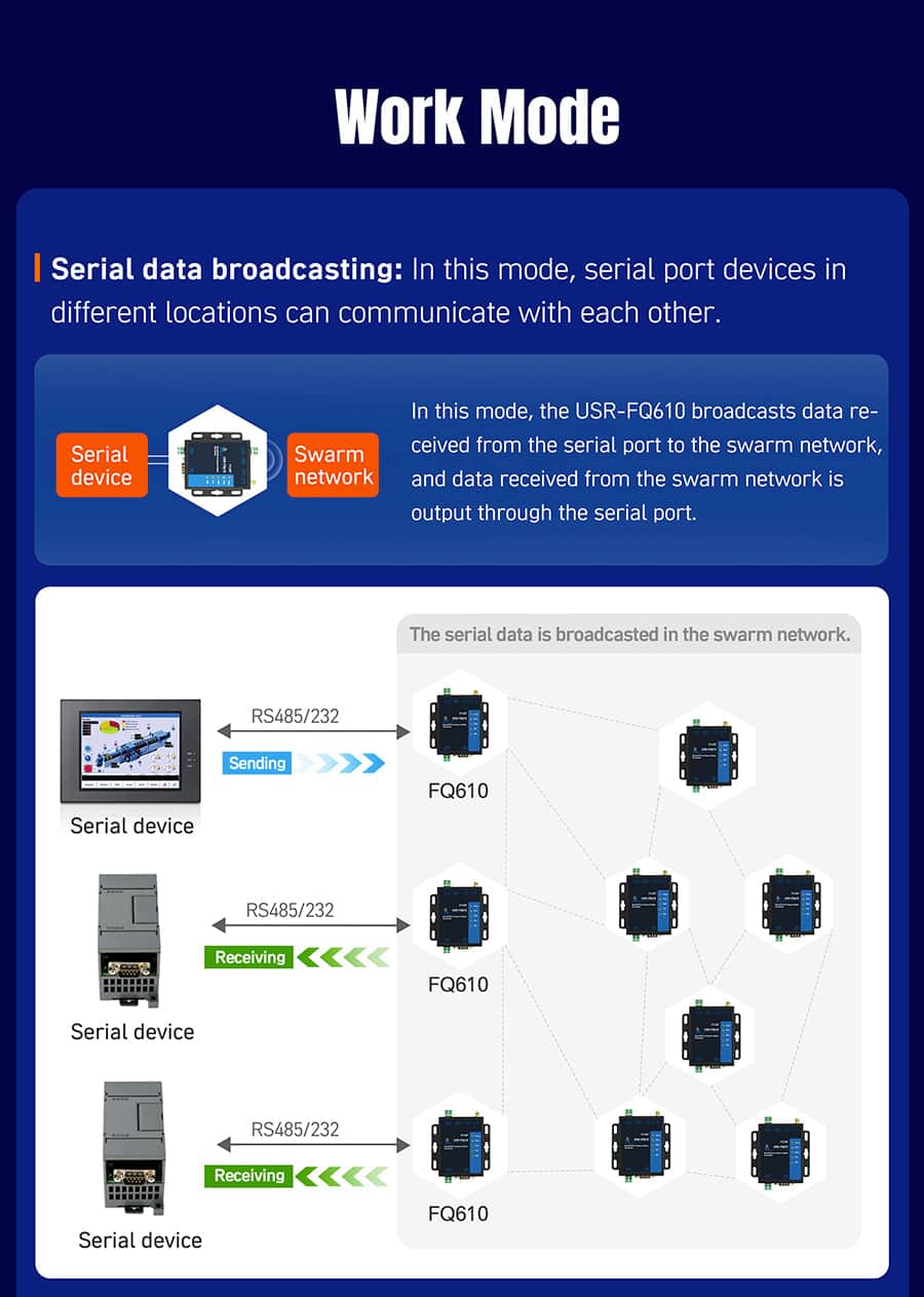 4 work modes: Wireless switch mode, network broadcast mode, serial broadcast mode, wireless serial device server mode
