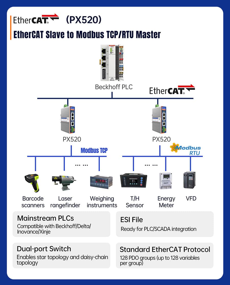 Up to 128 TXPDO and 128 RXPDO groups in EtherCAT, with 128 variables per group
