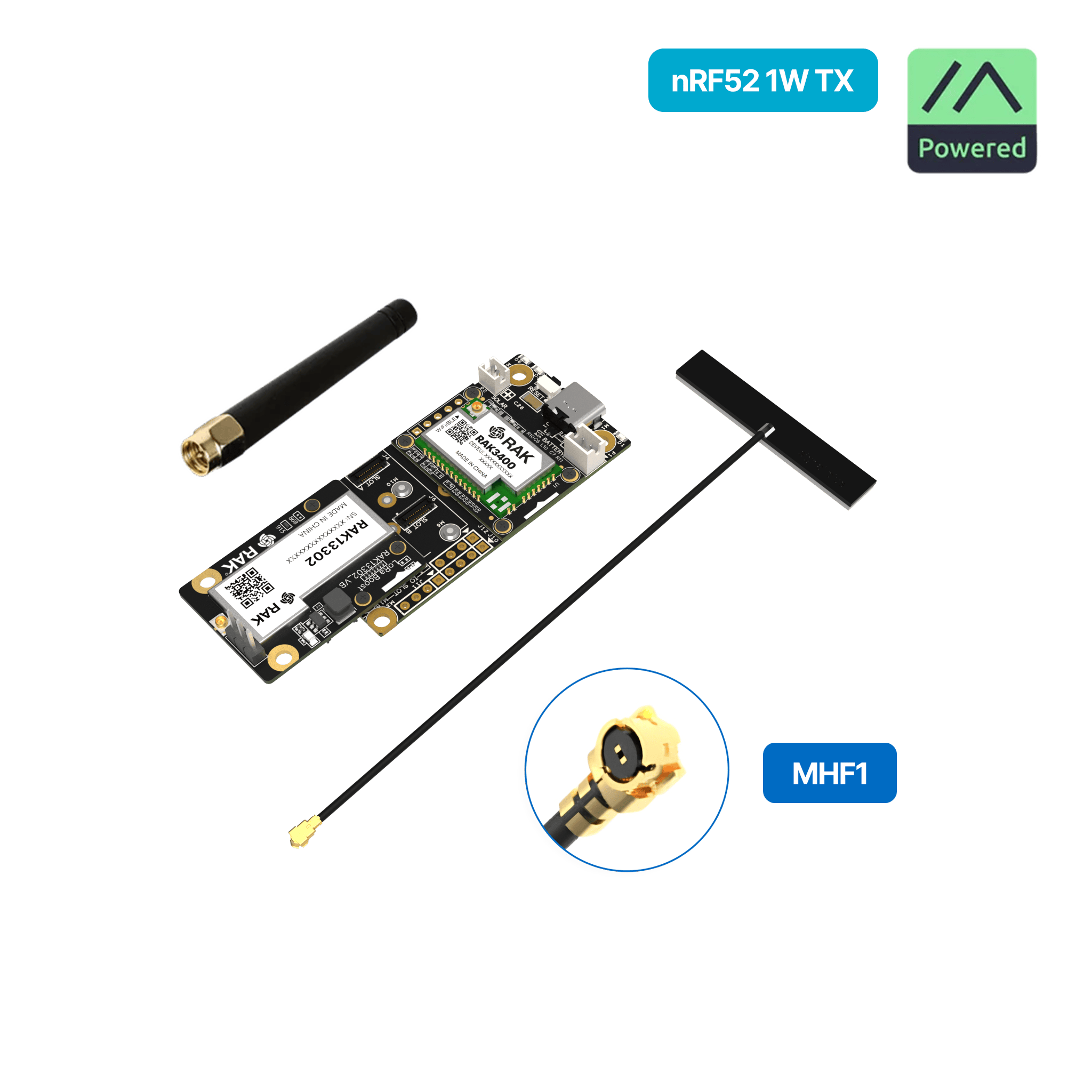 The WisMesh 1W Booster Starter Kit brings more TX power and better reception to Meshtastic networks. Powered by the RAK3401 WisBlock Core module with the Nordic nRF52840 MCU and a RAK13302 1W LoRa transceiver module, mounted on a RAK19007 Base Board.