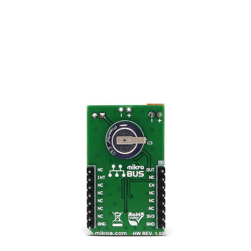 The connected load will be powered on either from the connected LiPo battery or the supercapacitor soldered on board. When the battery voltage drops under the 2.85V, the interrupt pin (routed to the mikroBUS™ INT pin) will be driven to a LOW logic state. The integrated nano-power management unit takes care of providing the proper charging conditions for the battery. When the battery is charged up to 3.25V - due to the hysteresis set with the voltage divider resistors - the INT pin will go to a HIGH logic state, once again. Also, thanks to the nano-power management unit, the battery will not get overcharged above 4.06V. The click board™ provides 2.6V/100mA for the connected external load on the output terminal.